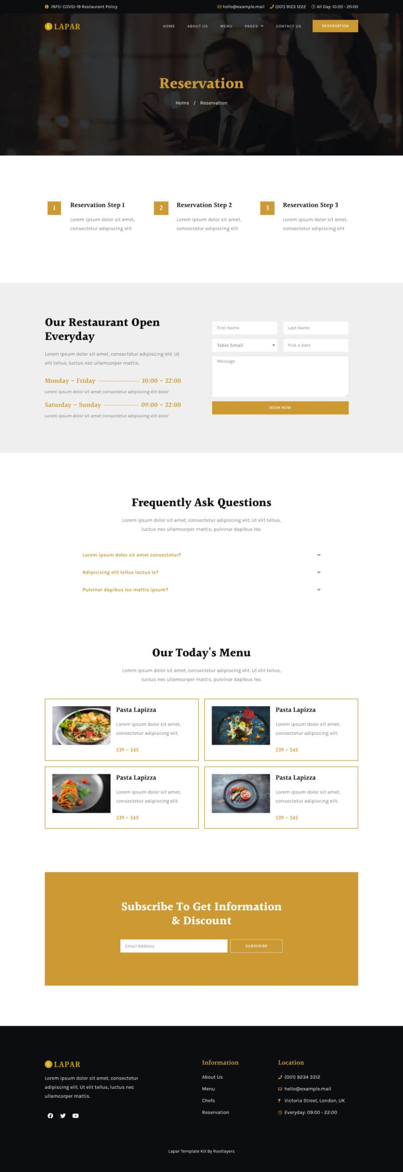 Reservation Home / Reservation 1 Reservation Step 1 Lorem ipsum dolor sit amet, consectetur adipiscing elit 2 Reservation Step 2 Lorem ipsum dolor sit amet, consectetur adipiscing elit 3 Reservation Step 3 Lorem ipsum dolor sit amet, consectetur adipiscing elit Our Restaurant Open Everyday Lorem ipsum dolor sit amet, consectetur adipiscing elit. Ut elit tellus, … Continue reading Reservation